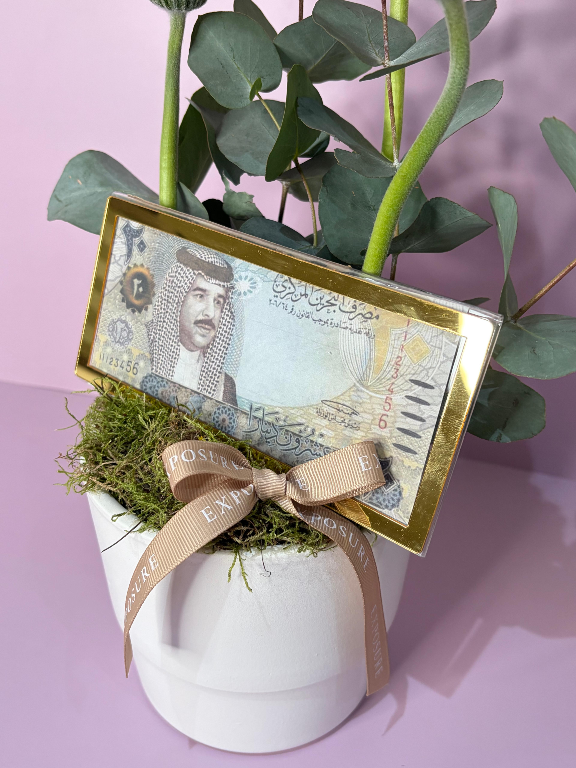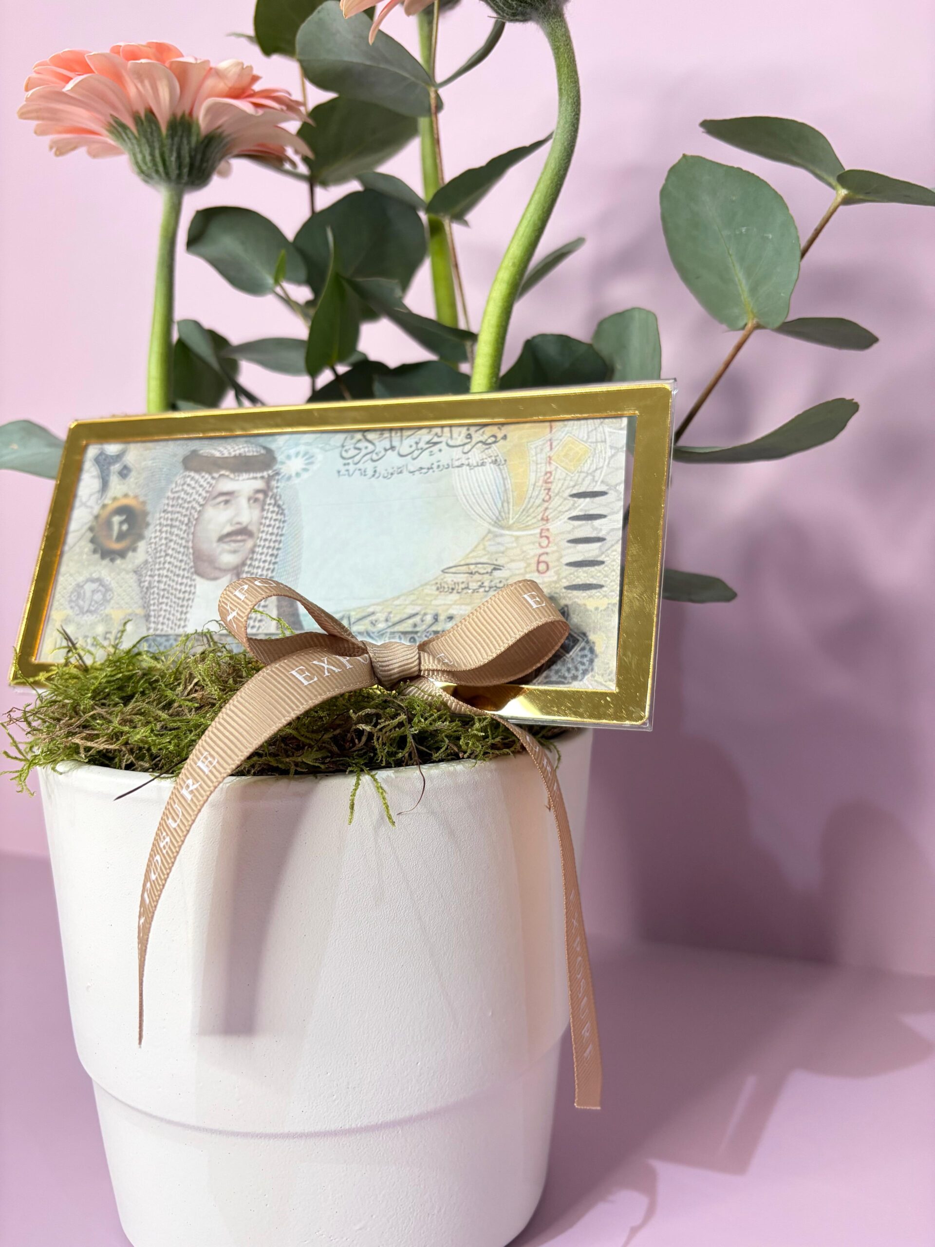 An elegant ceramic vase arranged with natural flowers, acrylic envelope designed to hold cash, offering a unique and stylish way to present your monetary gift. Please note: Cash is not included. Our team will contact you to arrange collection
