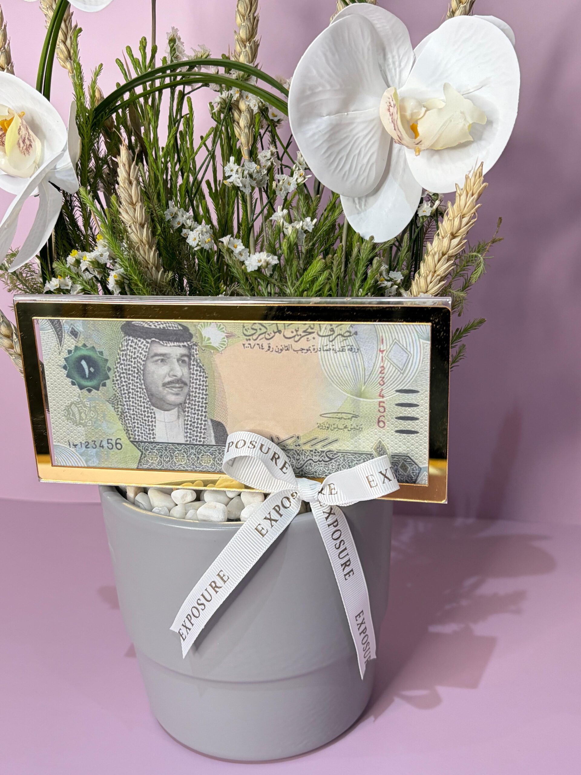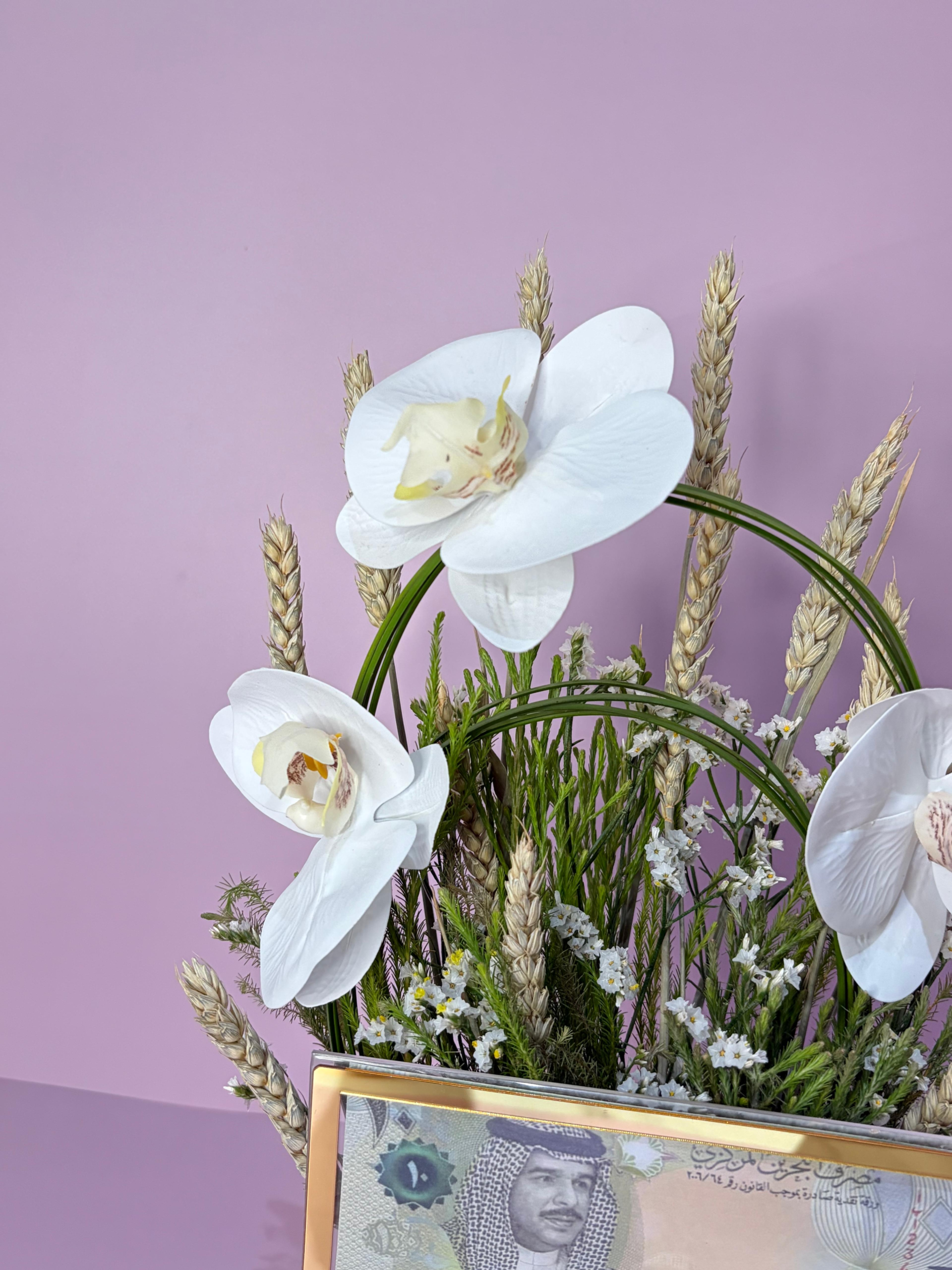 An elegant ceramic vase arranged with mix flowers, acrylic envelope designed to hold cash, offering a unique and stylish way to present your monetary gift. Please note: Cash is not included. Our team will contact you to arrange collection