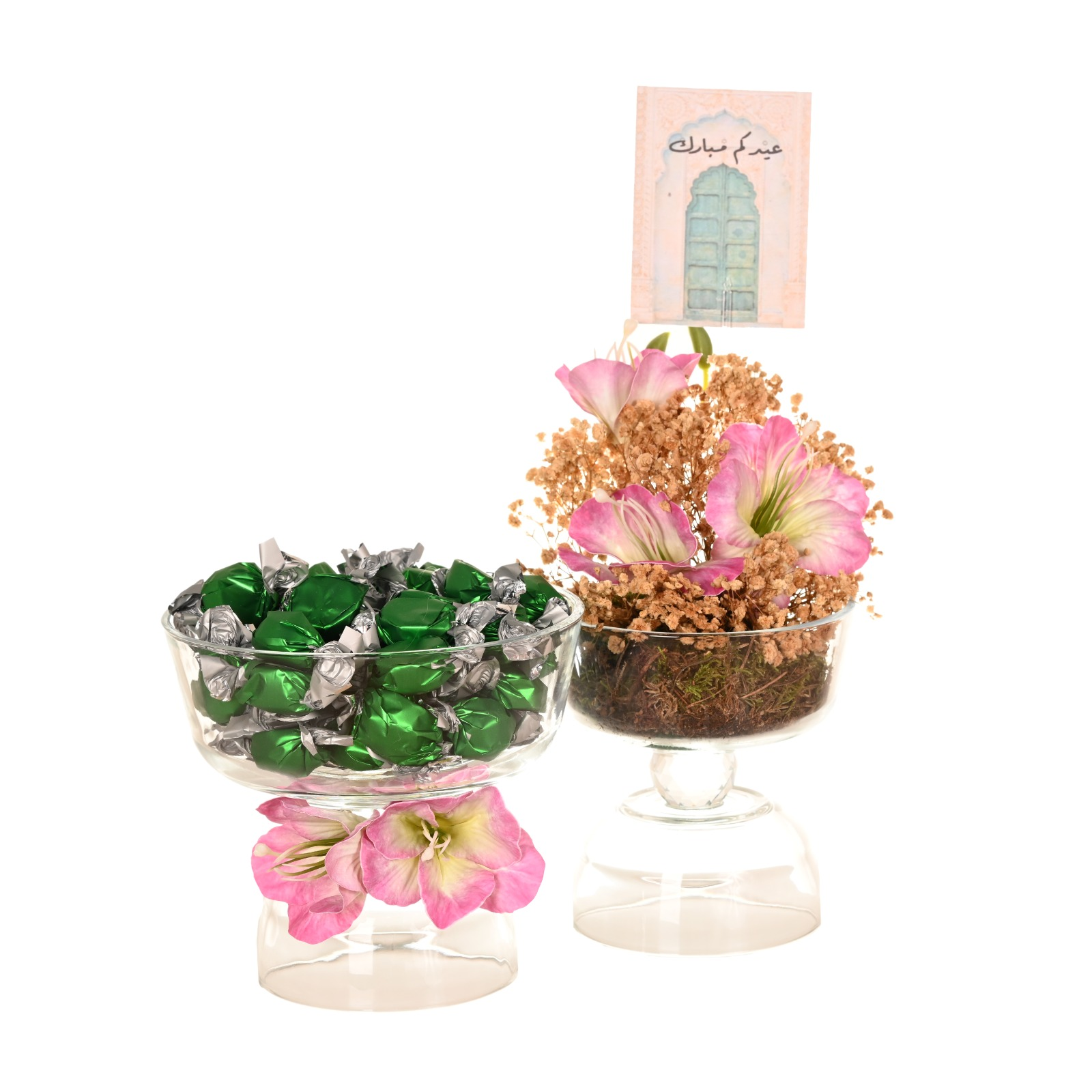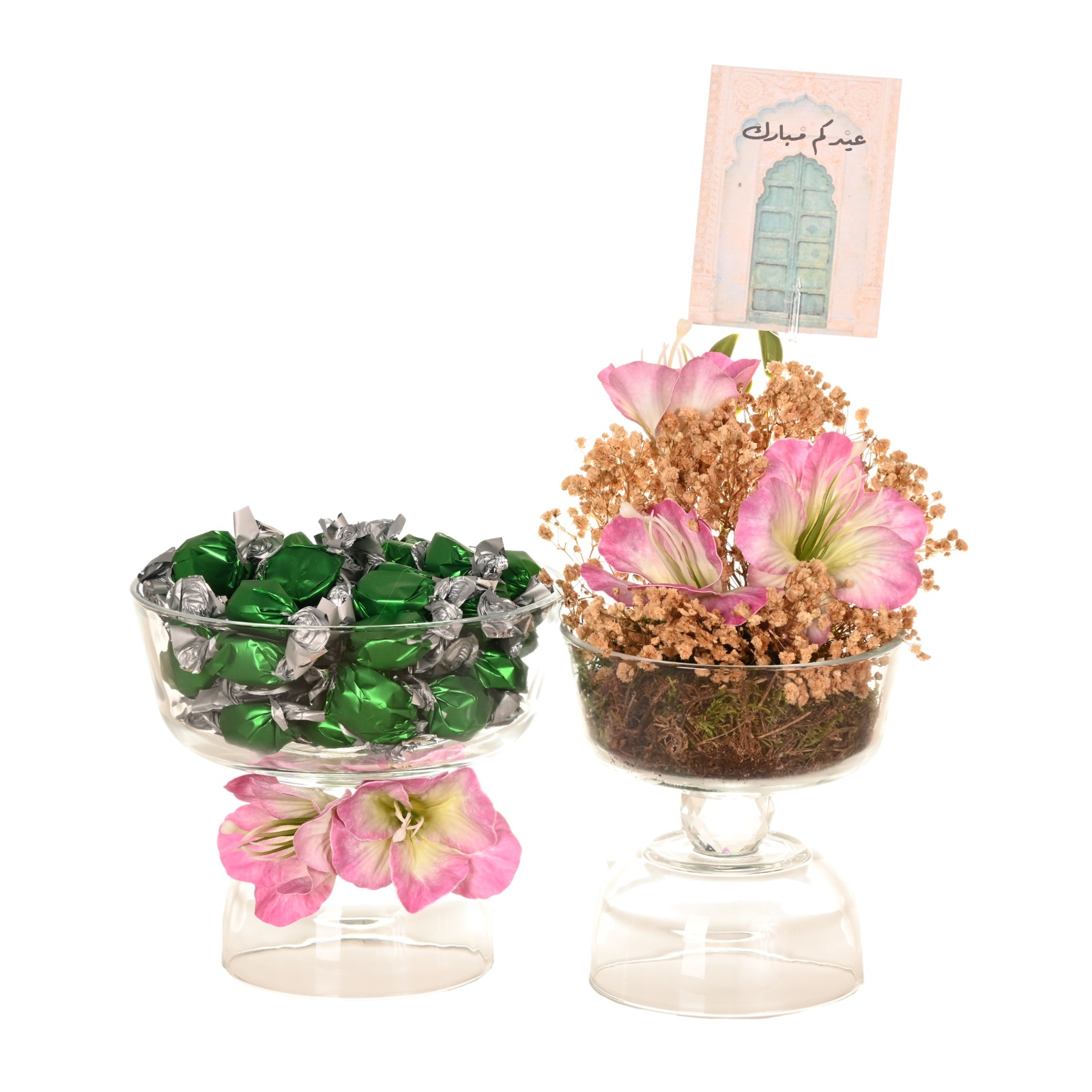 An elegant and modern Eid gift and hospitality set featuring two stylish glass
