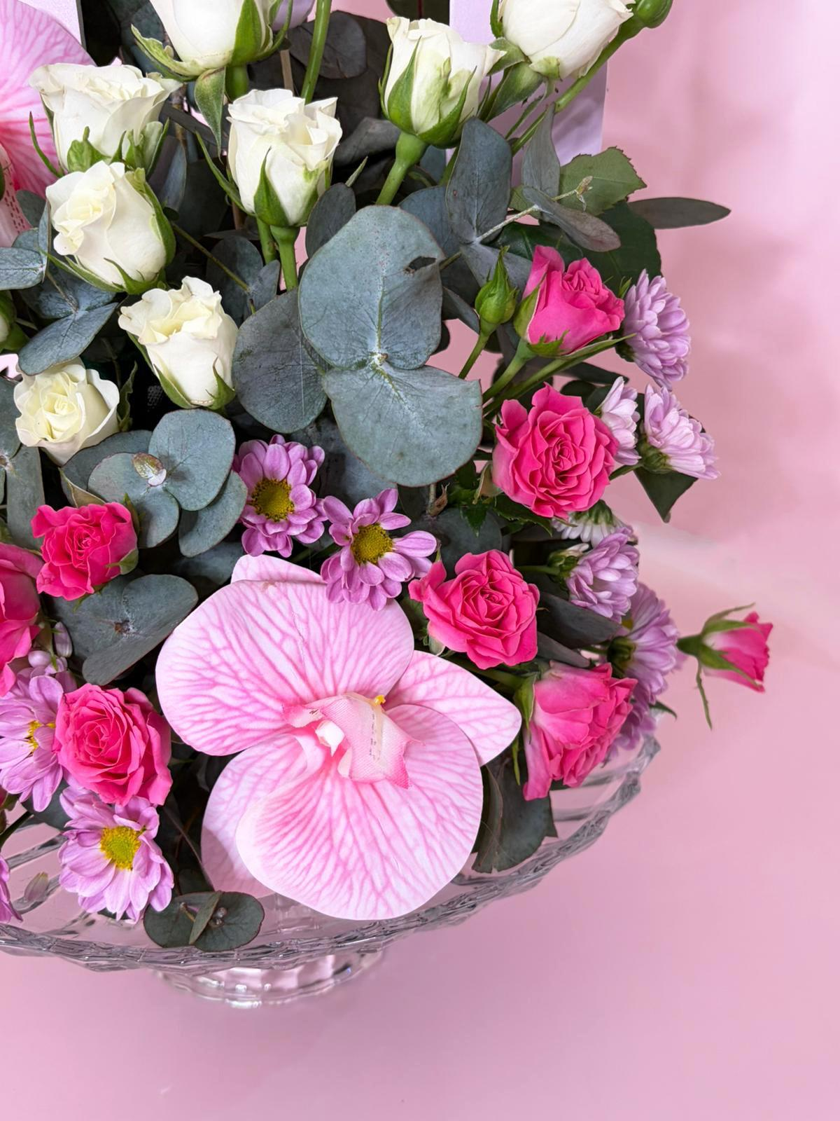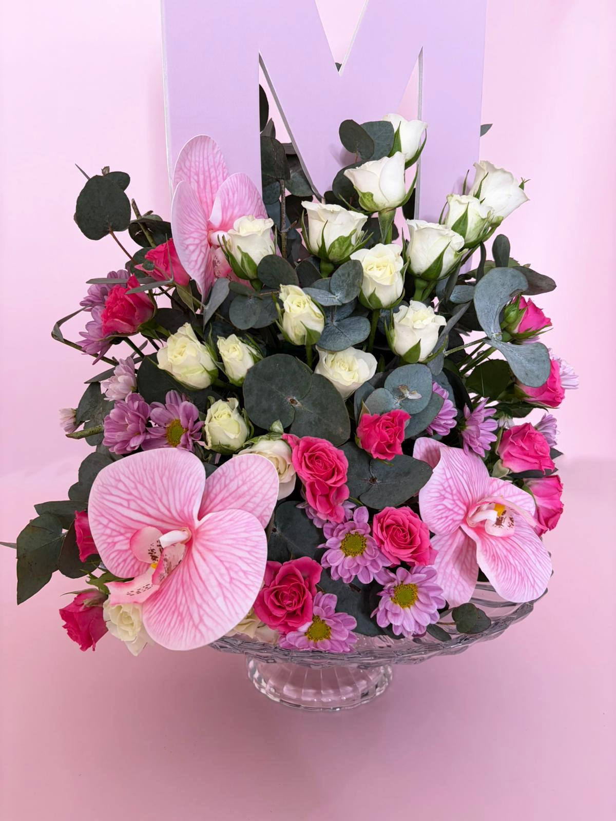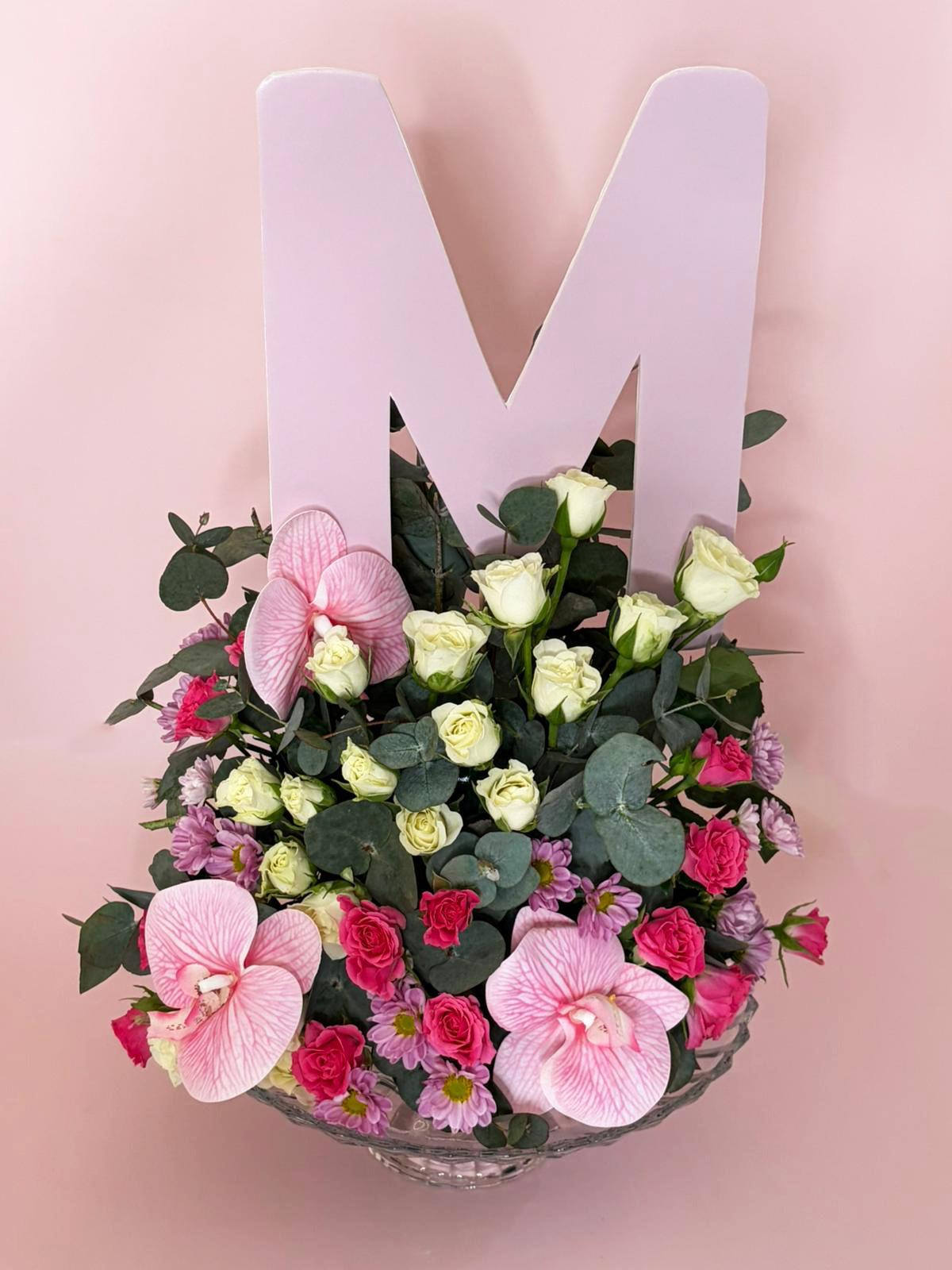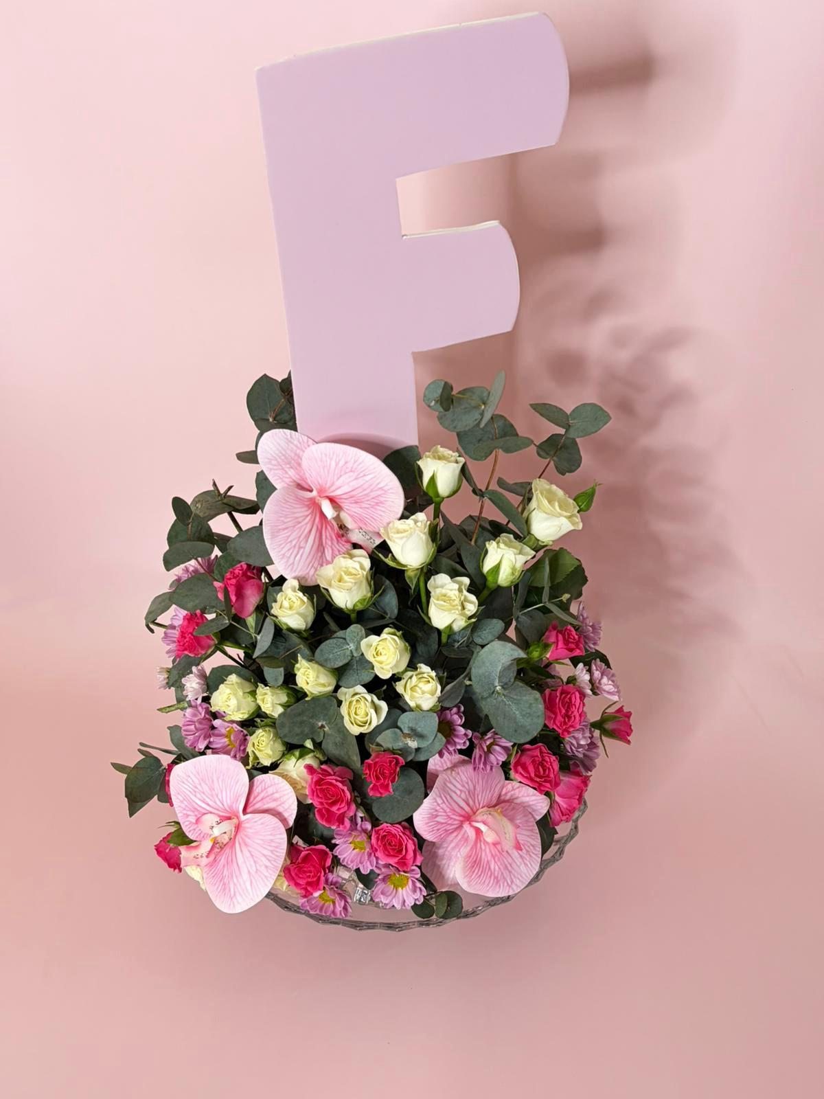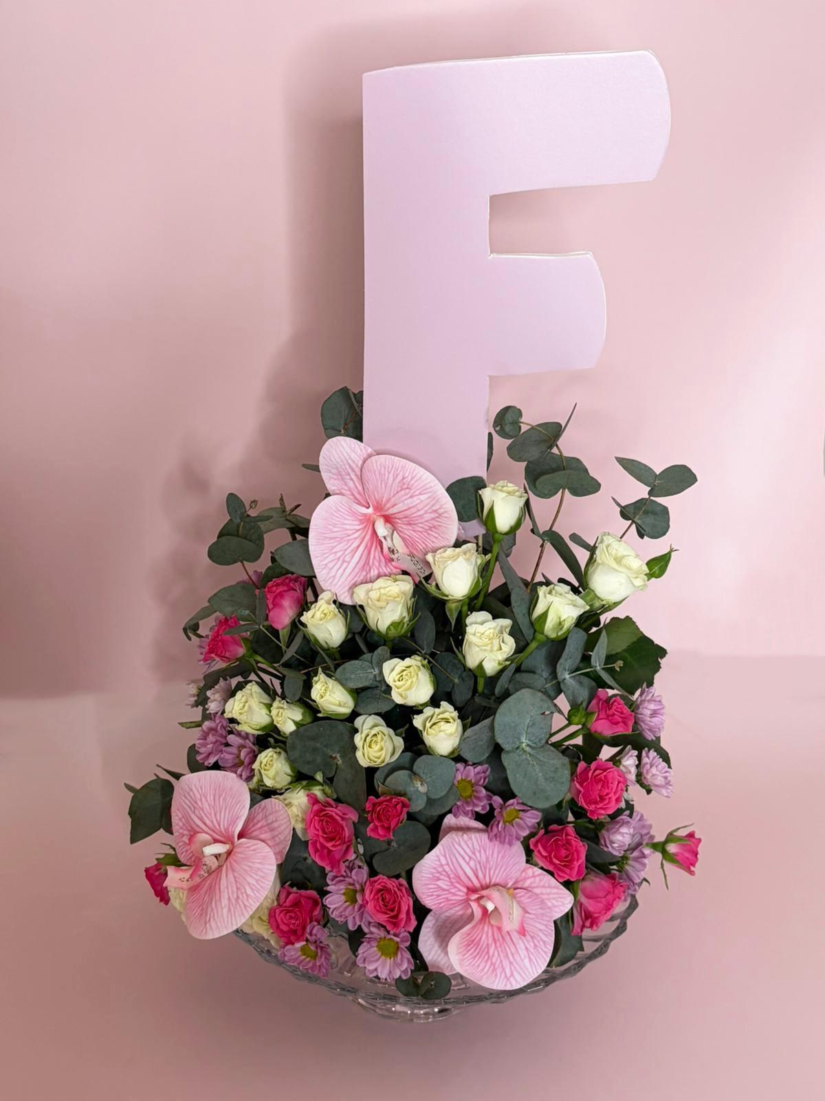 Elegant floral arrangement on a glass stand with a custom letter, designed in soft pink and white tones. A perfect personalized gift.