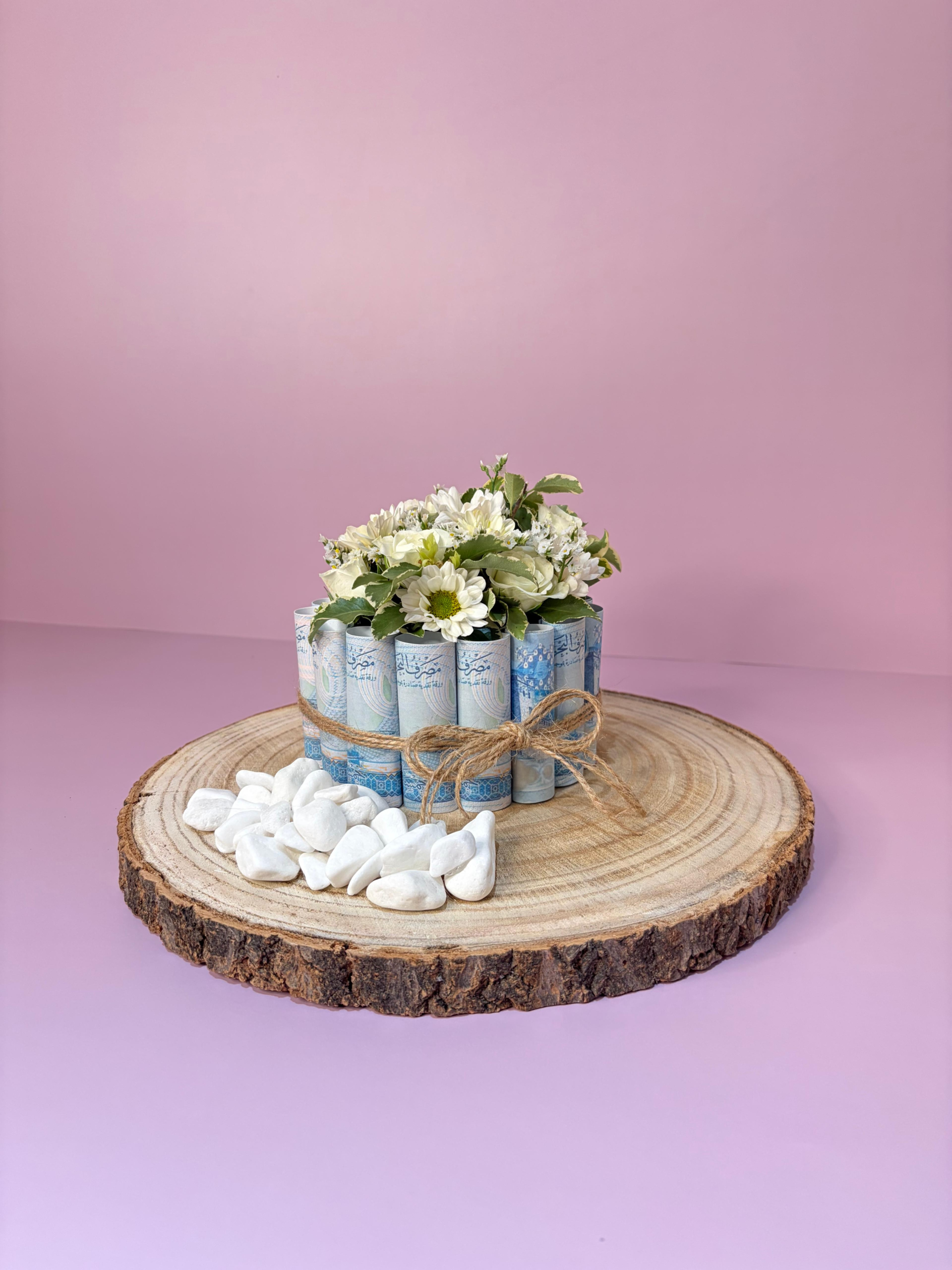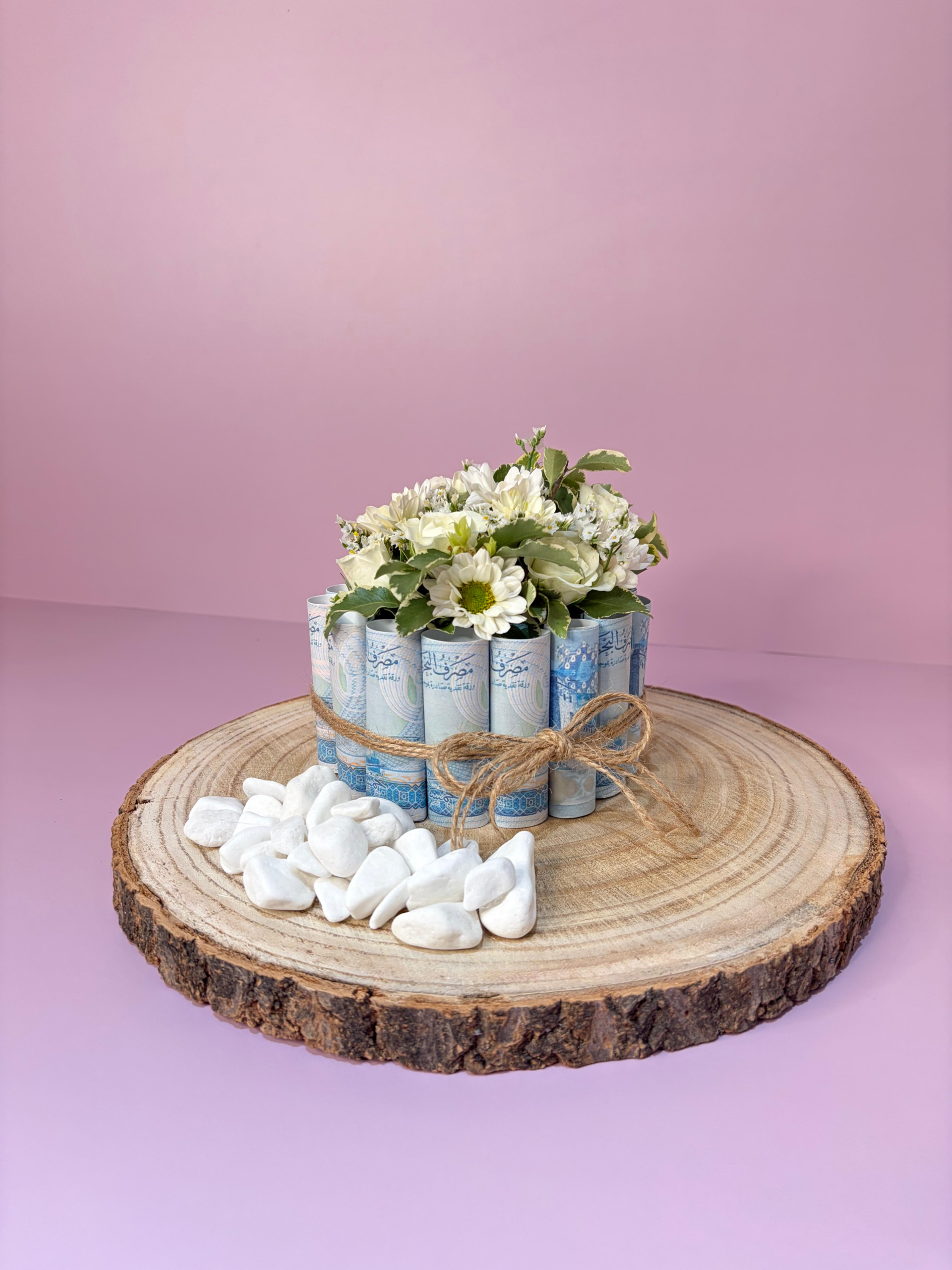 Elegant cash gift with fresh flower and wooden Base , a creative and luxurious way to present money gifts . Please note: Cash is not included. Our team will contact you to arrange collection