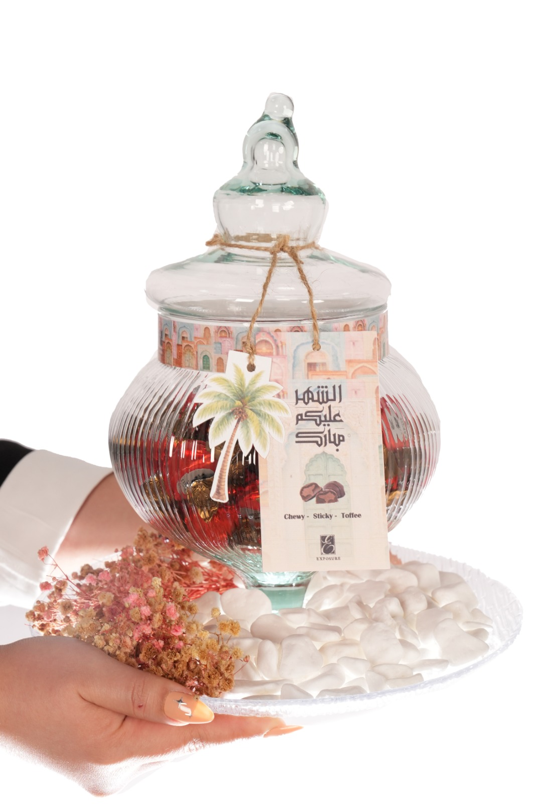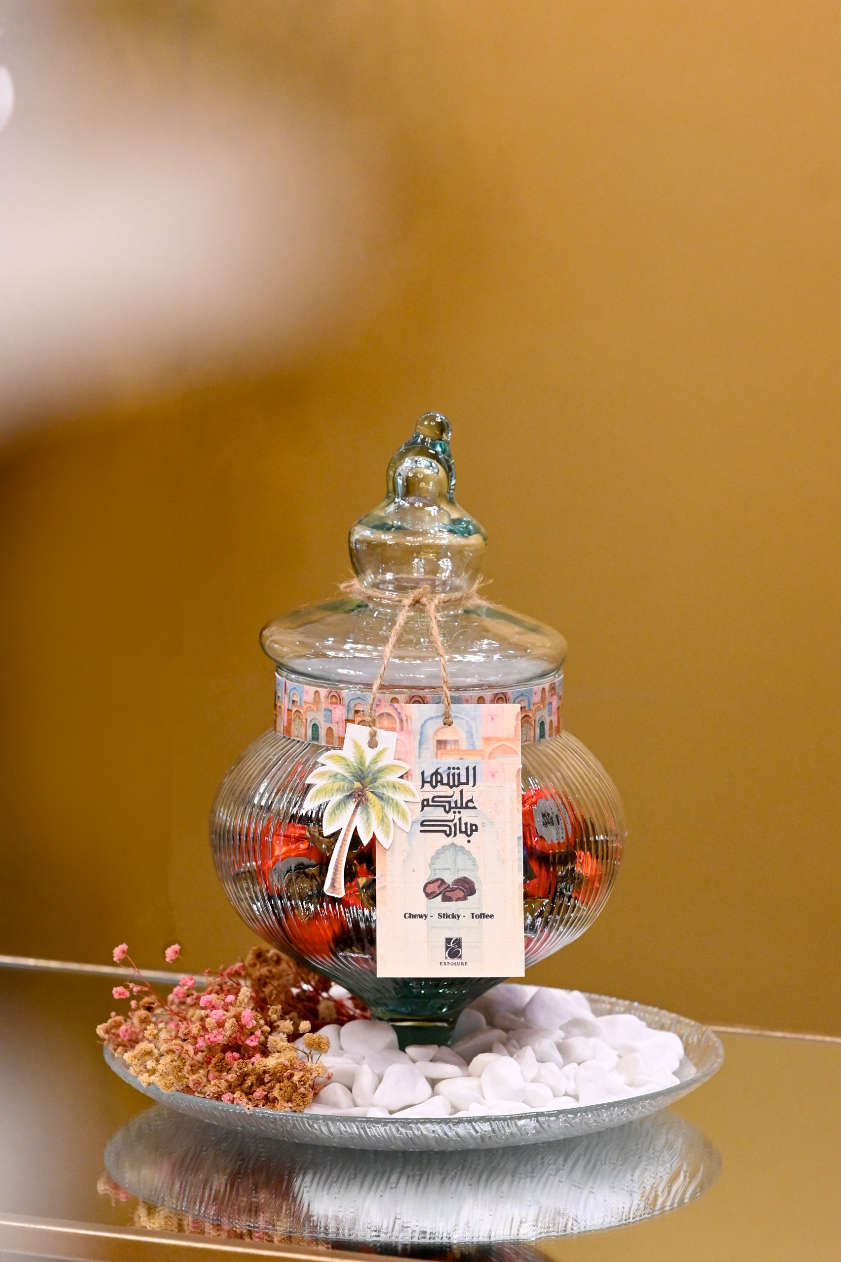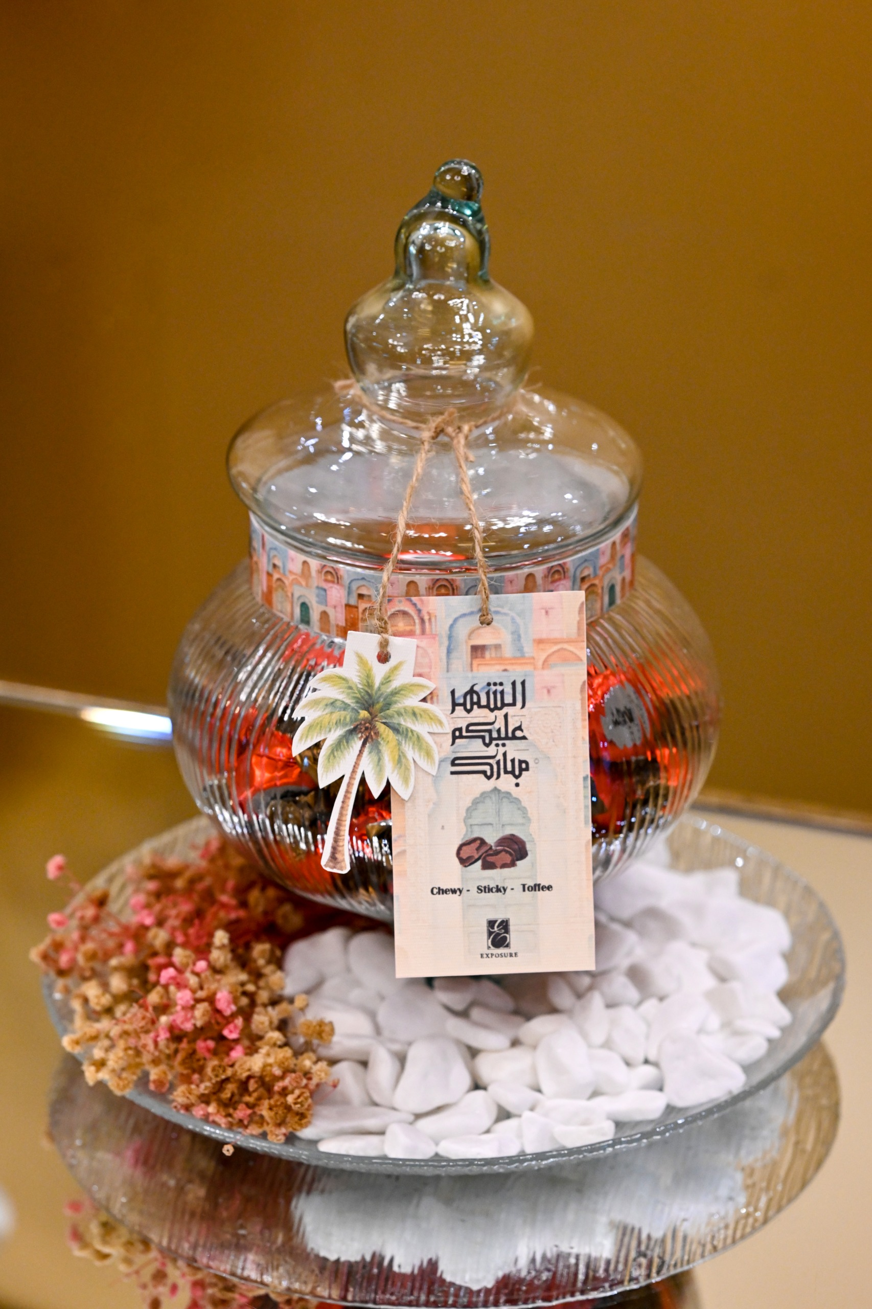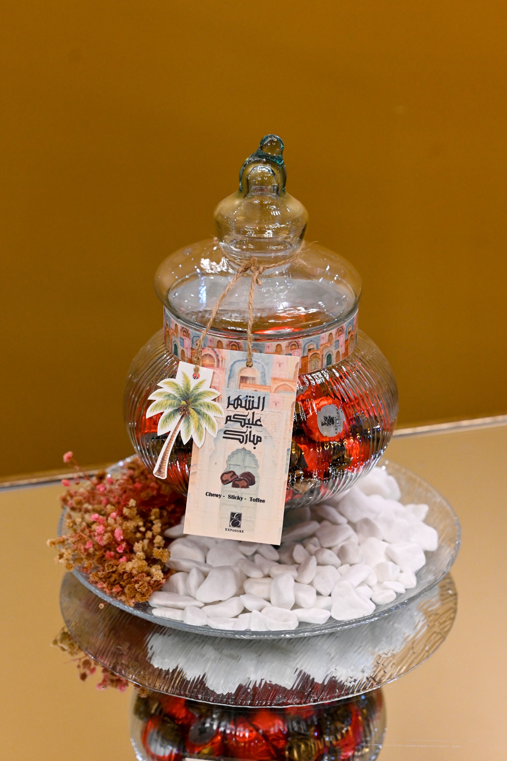 Perfect Ramadan gift , An elegant glass jar filled with 50 pieces of delicious Sticky toffee .decorated with flowers and greeting Card.