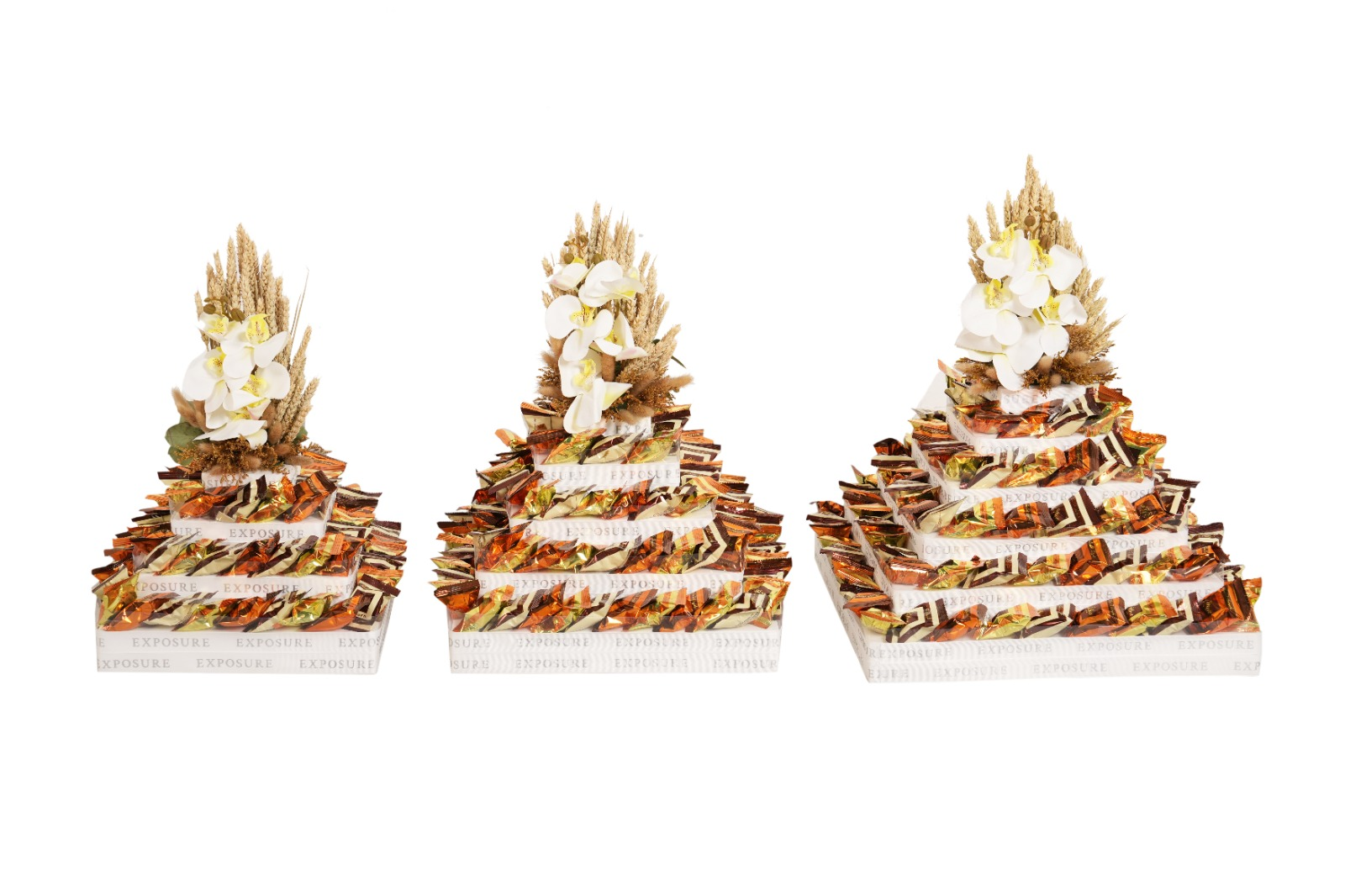 An elegant Luxury Chocolate Tower with 120 pieces of mix Premium Chocolates (Tartufo white.Tartufo Gianduja, Tartufo nougat).Arranged in Stylish tower design.