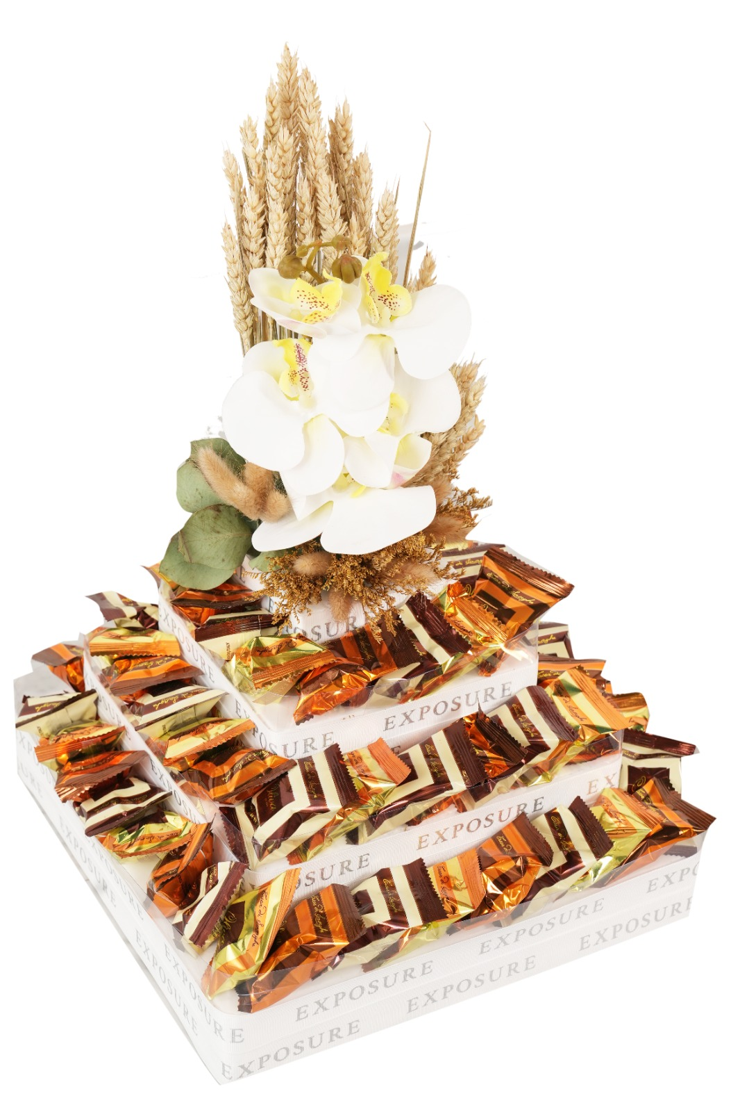 An elegant Luxury Chocolate Tower with 75 pieces of mix Premium Chocolates (Tartufo white.Tartufo Gianduja, Tartufo nougat).Arranged in Stylish tower design.