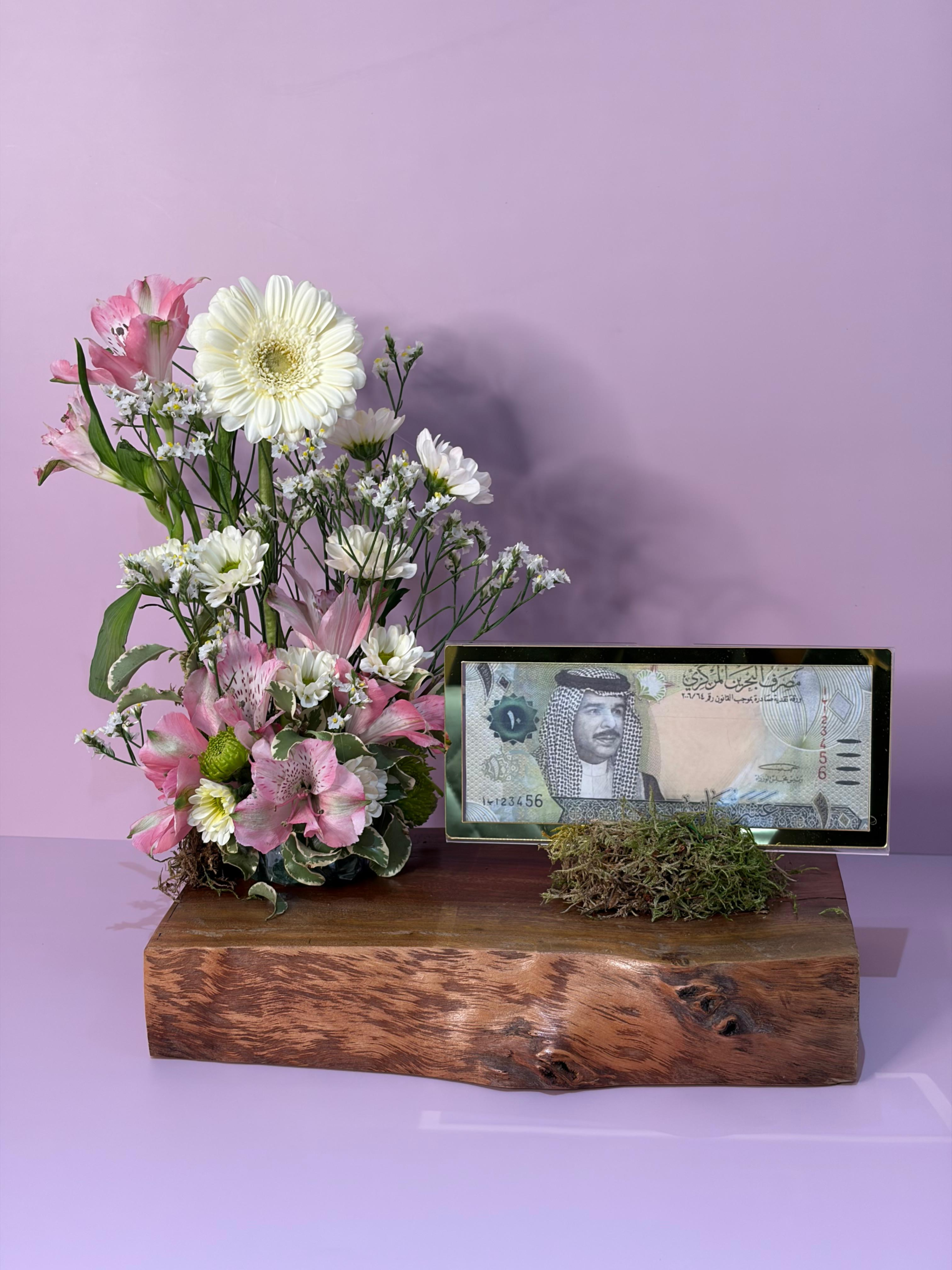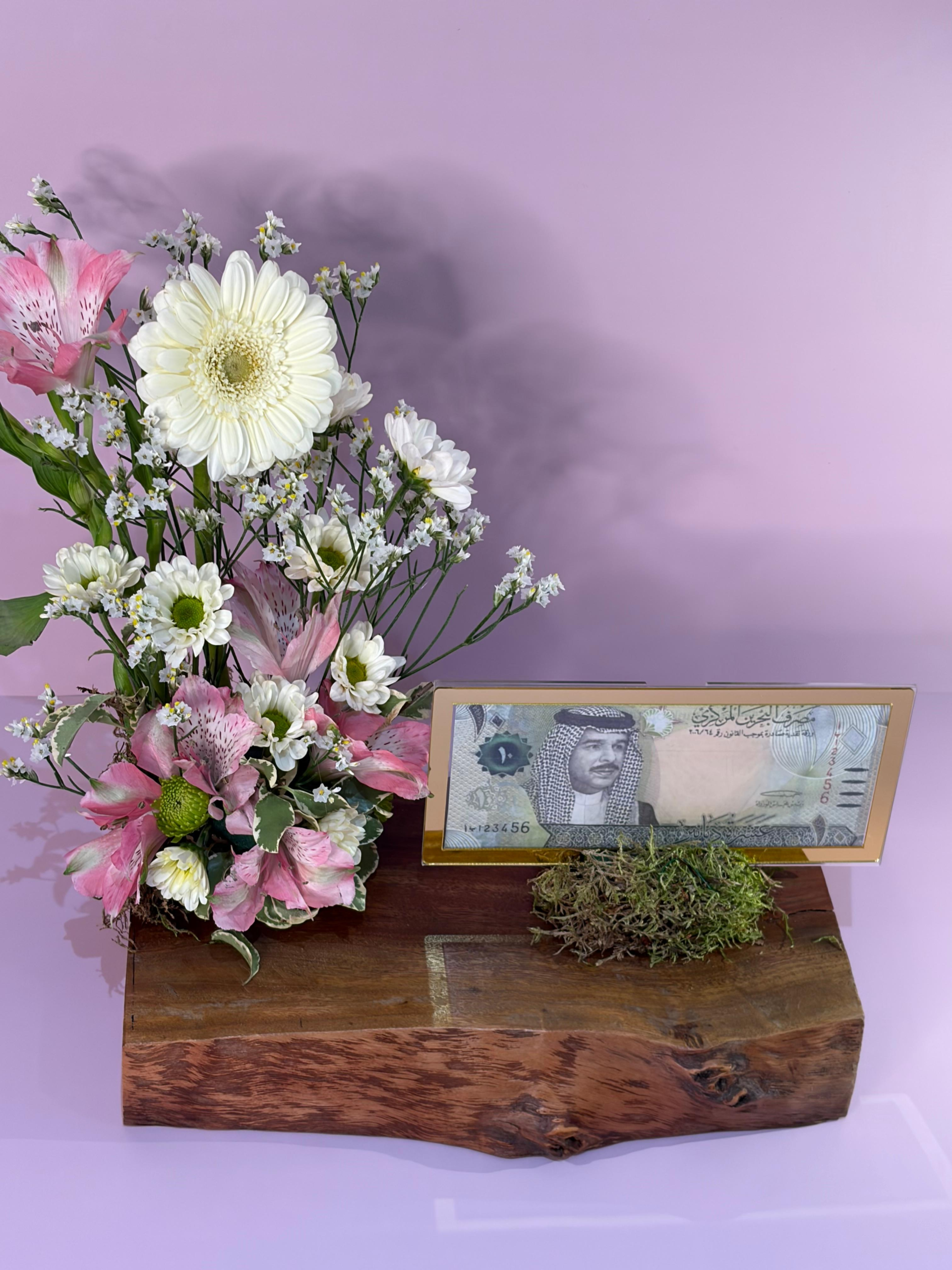 A distinctive natural wooden base decorated with vibrant natural flowers, offering a beautiful and elegant way to present a cash gift. Please note: Cash is not included. Our team will contact you to arrange collection.