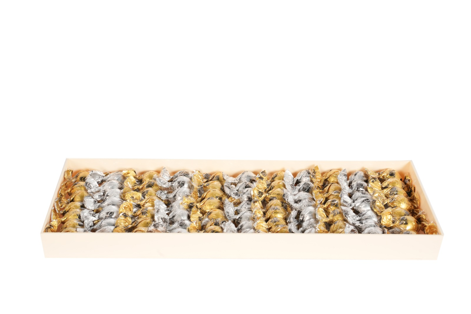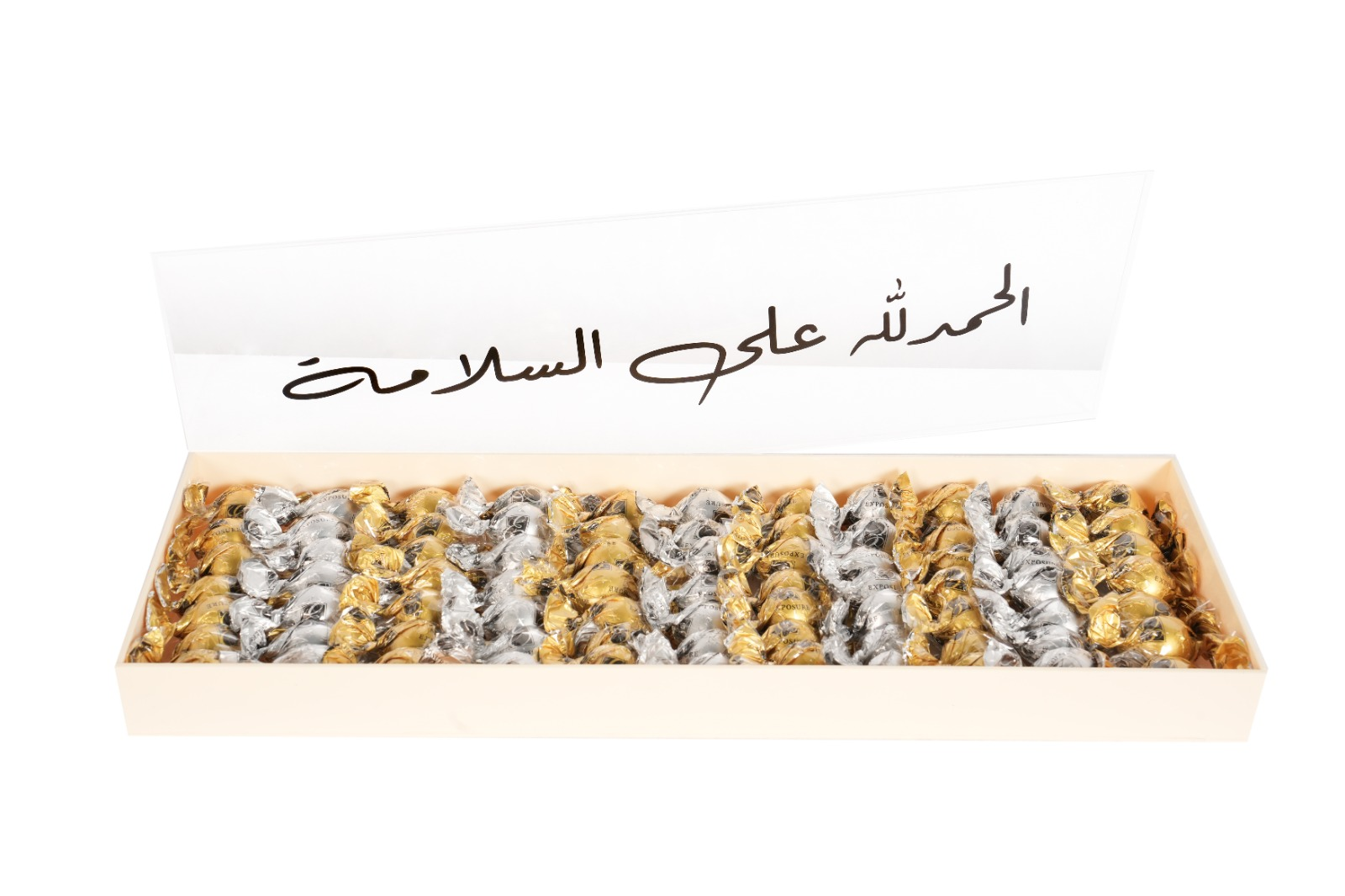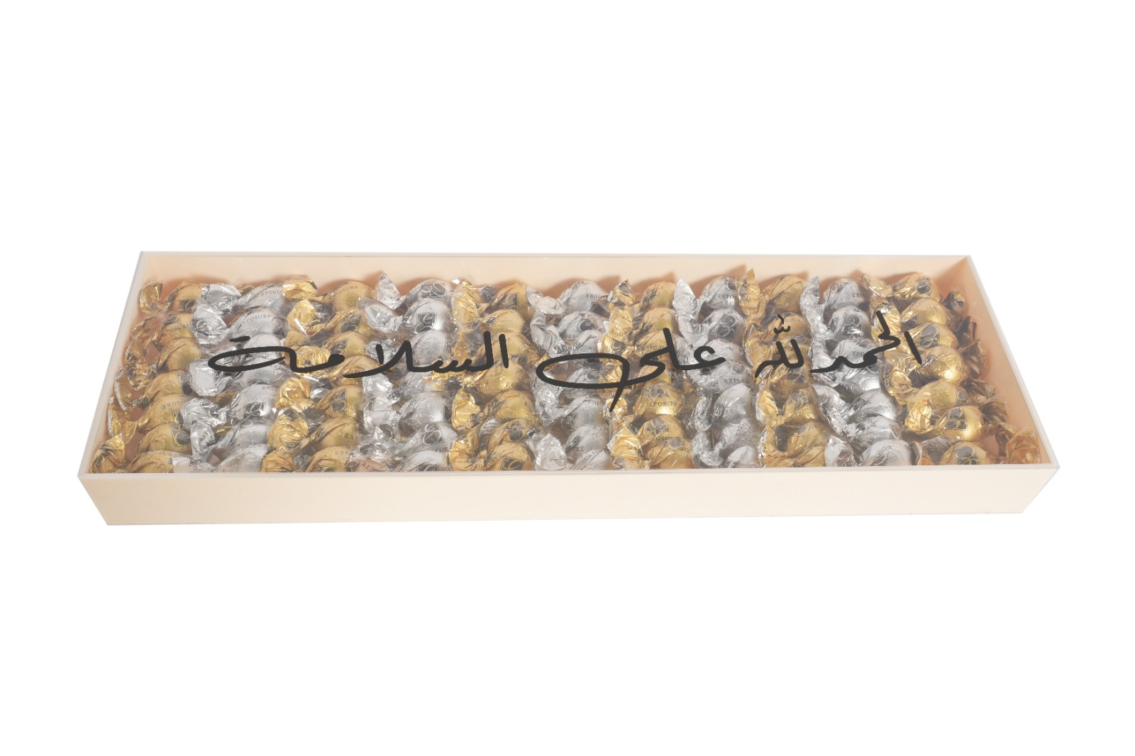 Luxury Acrylic tray with Clear Cover that showcasing their elegant arrangement.77 Pieces of Caramelized Hazelnut and Crouqant Pistachio. You can add your own Custom message on the Cover, making it a perfect personalized gift for any Occasion